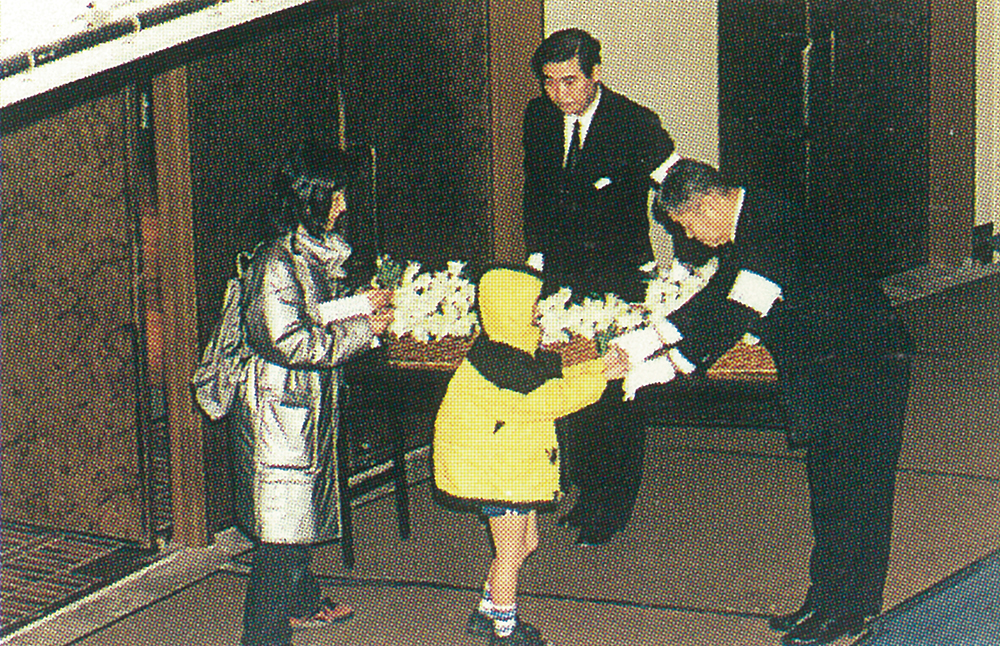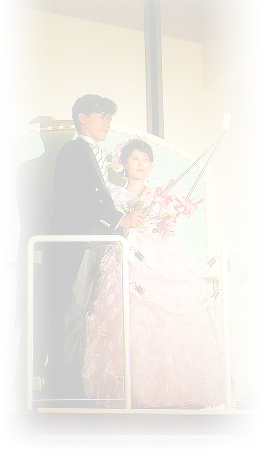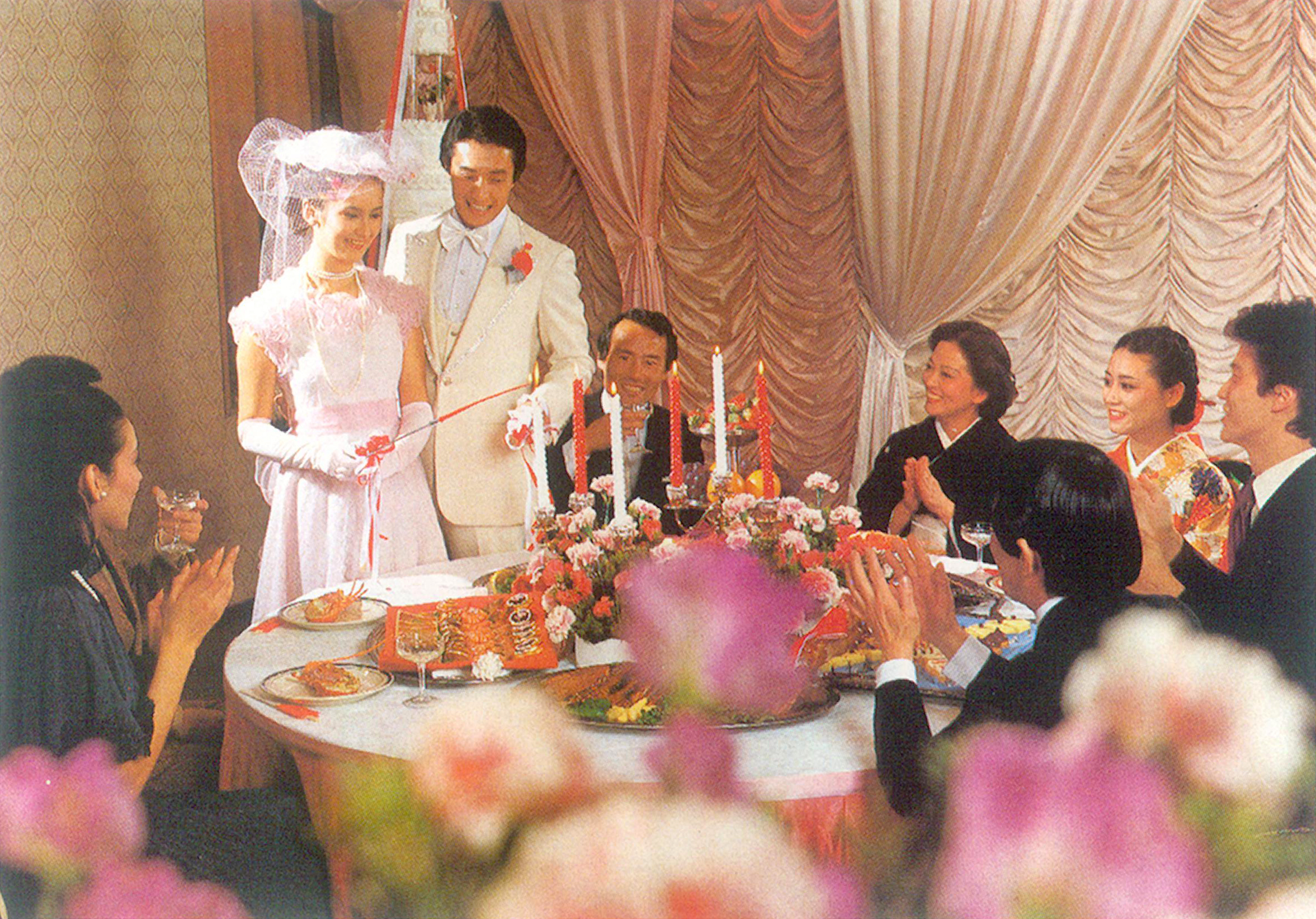 梅田玉姫殿の第一号挙式が昭和57年1月31日、14組のカップルを迎えて華々しく始まりました。最新の設備ときめ細やかな演出、音と光と映像の「玉姫殿しあわせのメルヘン」は、新しい旅立ちのお二人と列席者に深い感銘を与えました。会長 齋藤近次郎の夢を、前社長 齋藤眞一が実現しました。梅田玉姫殿の記念すべき感動の幕開けは、こうした素晴らしい後継の中でスタートしました。