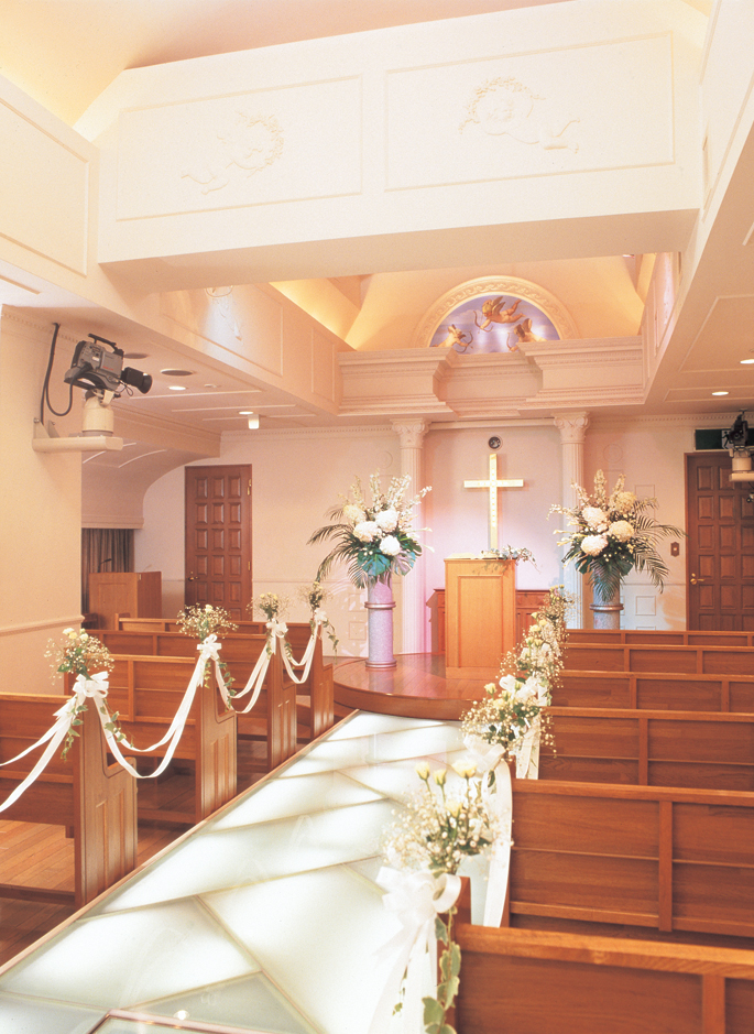 チャペルの特徴は第一に、外国人牧師の起用です。第二に、天井高6mの豪華な聖壇とそれを照らすステンド・グラス。第三に、チャペル内のあちこちに配されたカメラやビデオ・システムです。また、新郎新婦の立つ壇上はゆっくりと回転し、新郎新婦を色々な角度から捉えることが出来ます。そして、最後は新郎新婦が鳴らすウェディングベルと、参席者のフラワーシャワーが祝福の時を盛り上げます。2021年現在も多くの新郎新婦様がチャペル「バレンシア」にて挙式されています。