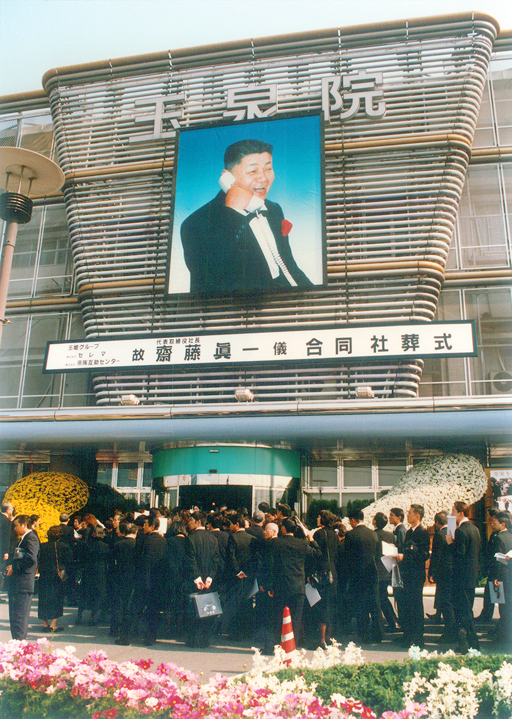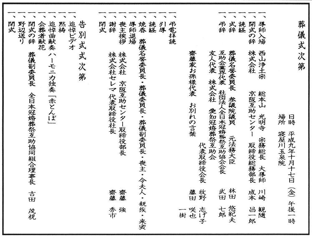 株式会社京阪互助センター取締役・全国玉姫グループ齋藤いつ会長の合同葬儀が平成10年1月28日シティーホール西ノ京で執り行われました。(平成9年12月26日逝去 行年95歳)