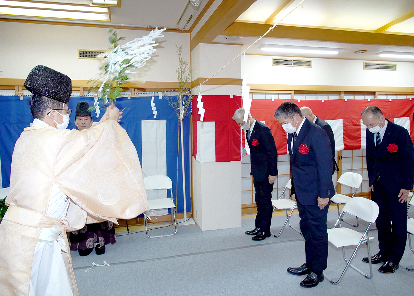 2019年3月22日メイプルホール桜塚、7月8日メイプルホール旭の地鎮祭。6月21日にはメイプルホール寝屋川公園の起工式が執り行われました。新元号での晴れやかなスタートと工事の無事、会館の発展を祈念しました。